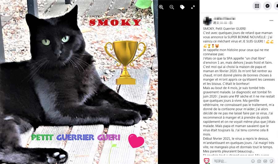 Mais au bout de 4 mois, je suis tombé très gravement malade. Le diagnostic est tombé fin juin 2020 : j’avais une PIF sèche et il ne me restait que quelques jours à vivre. Ma gentille vétérinaire, ne connaissant pas le traitement, m’a donné de la cortisone pour m’aider; j’ai alors décidé de ne pas me laissé faire par ce virus. J’ai recommencé à manger et à prendre du poids rapidement et on ne voyait même plus que j’étais malade. Mais papa et maman savaient que le virus était toujours là. J’ai tenu comme cela 8 mois.